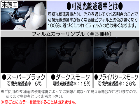 ・もっとも濃いスモーク=スーパーブラック5%・濃いスモーク=ダークスモーク15%・純正同様のスモーク=プライバシースモーク26%ご注文後の色の変更は出来かねます。